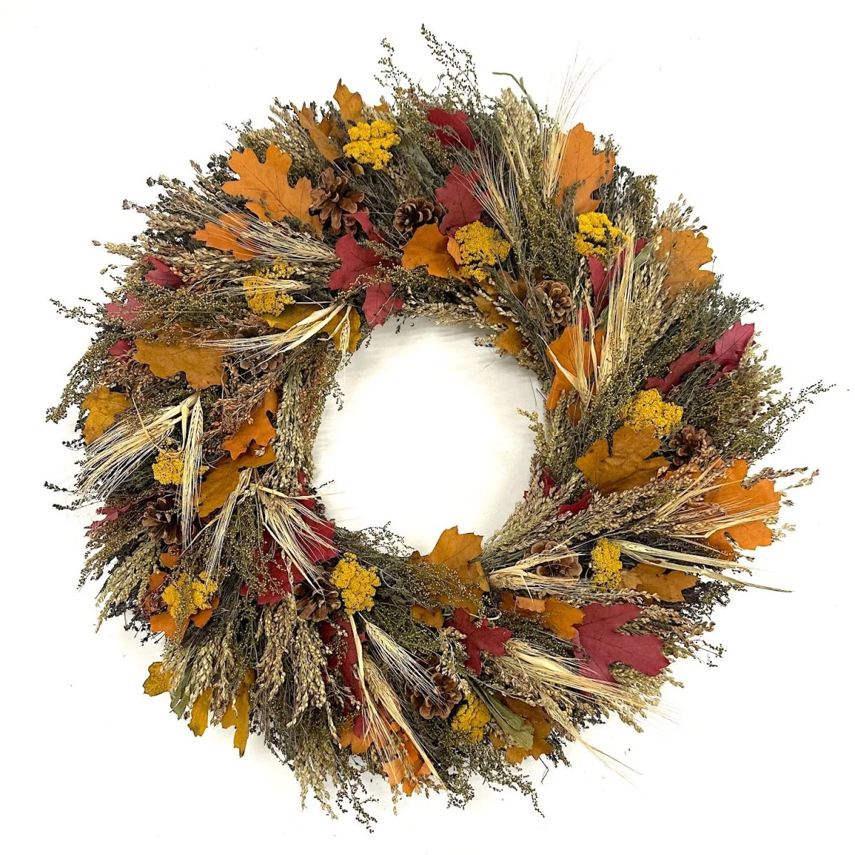 Our Autumn Harvest Wreath is true to its name, bursting with fall colors that will take you from late summer into the holidays, helping you celebrate harvest festivals, Halloween parties and Thanksgiving. Dried yarrow, pine cones, broom corn, wheat, sweet annie, flax, and preserved fall leaves, are all artfully displayed on a fragrant, mixed herb base. Capture fall's beauty and usher in the holidays with this beautiful lush wreath.