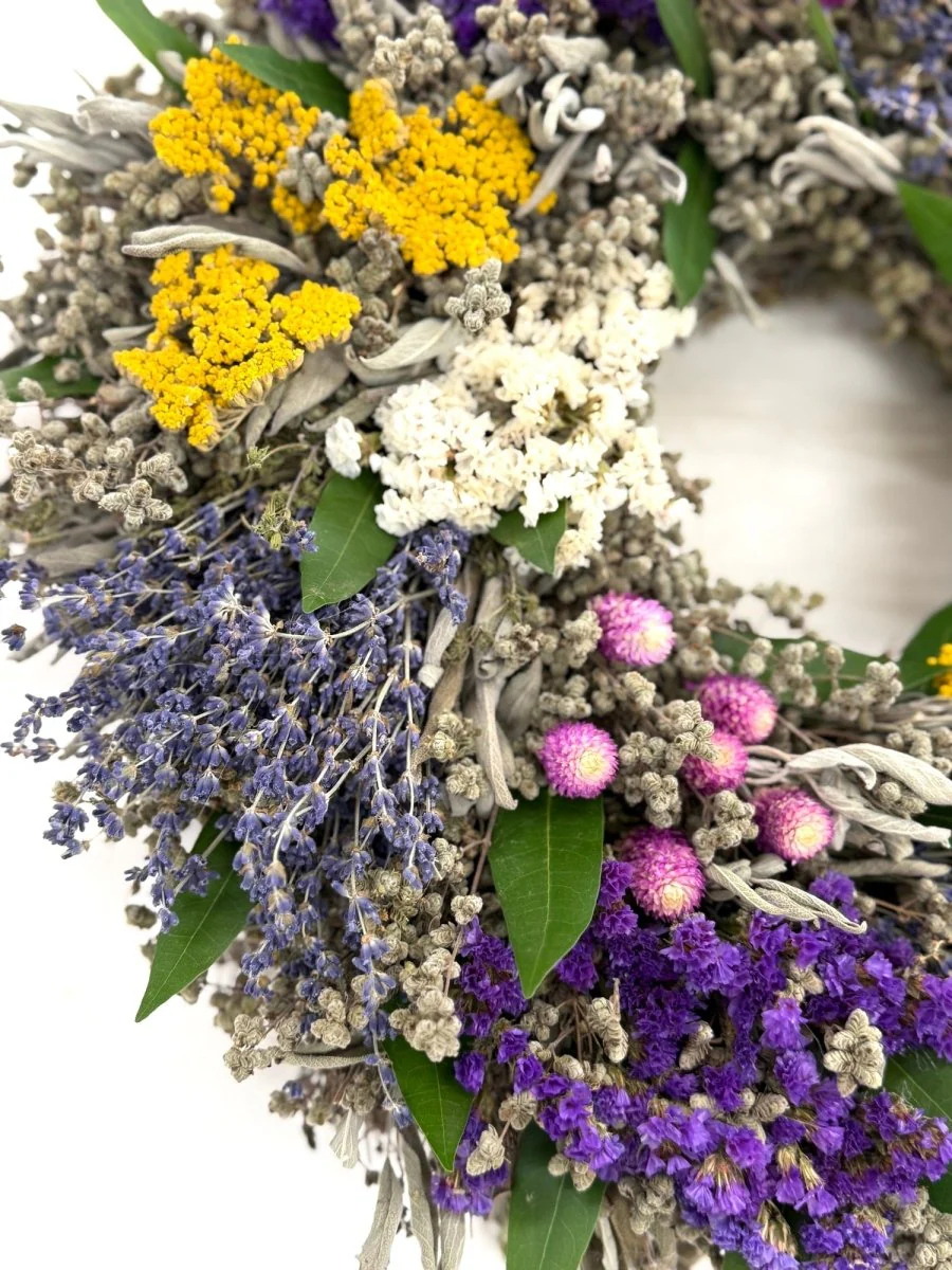 This lush wreath features herbs, lavender, statice, yarrow and pink globe amaranth. This dried fragrant wreath will make a bright and beautiful statement in any room or on your front door. The florals make it a wonderful piece for Spring through Summer.