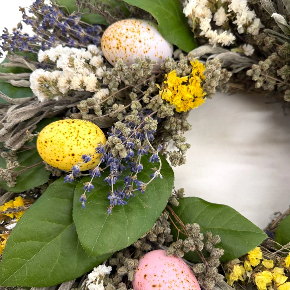 Indulge in the joy of Easter and the arrival of Spring with this luxurious egg wreath. Lively faux eggs are nestled among fragrant spring herbs and adorned with fresh lemon leaves. The combination creates a delightful wreath that will enliven your front door or any area of your home.