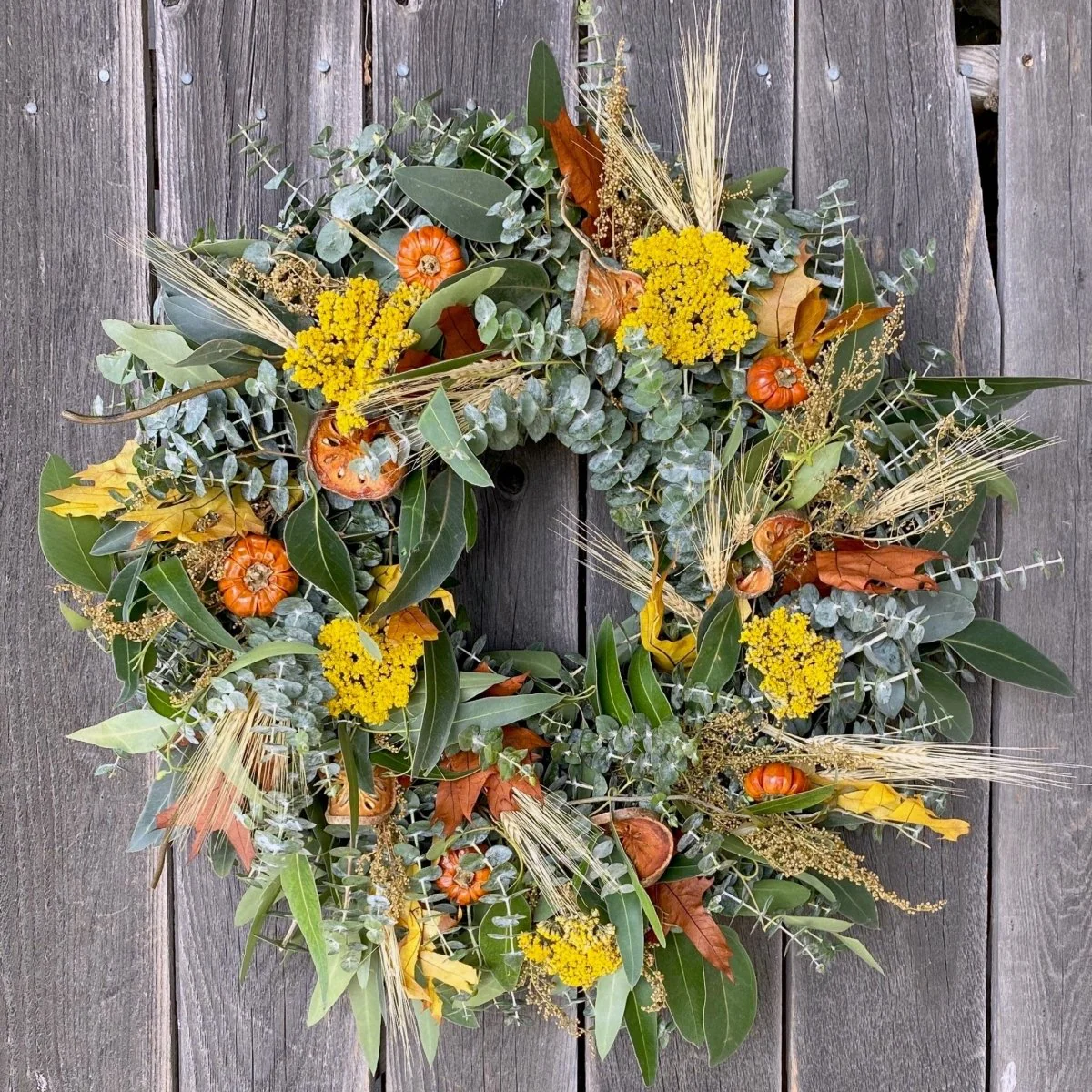 Bring fall indoors with this vibrant and wonderfully fragrant wreath. Our Fresh and Fragrant Wreath features a mixture of fresh and dry elements that compliment each other well. The fragrance stems from the fresh eucalyptus and bay. The dry quince slices, cherry peppers, sweet annie, preserved fall leaves, wheat and curly willow add perfect touches of colors and textures.