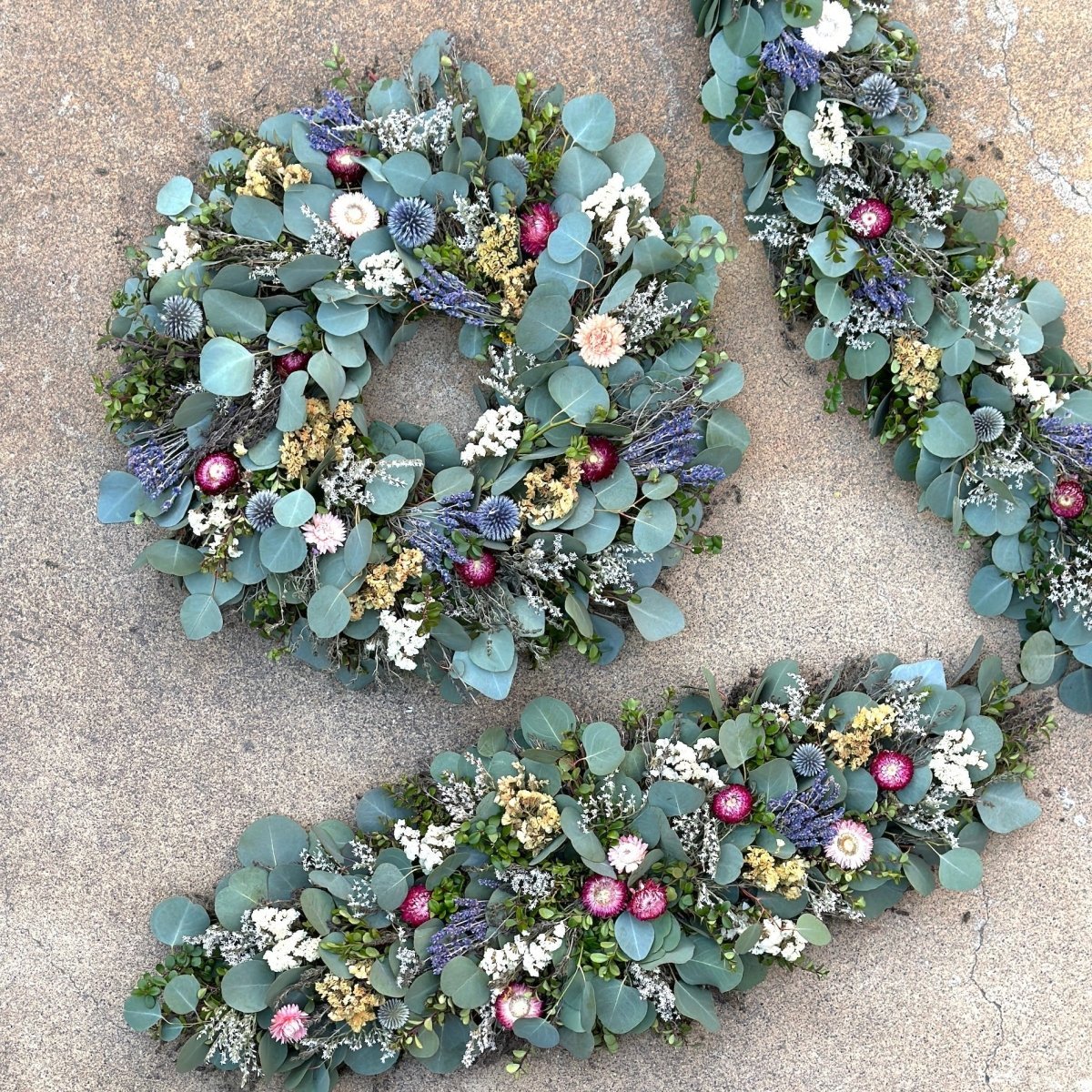 Lavender, strawflowers and statice compliment this beautiful lush fresh Botanical Wreath. The fresh eucalyptus and boxwood combined with fragrant dried savory create texture and the pops of color add a touch of simple elegance. We can’t wait for you to see it in person. Makes a wonderful gift for any occasion.