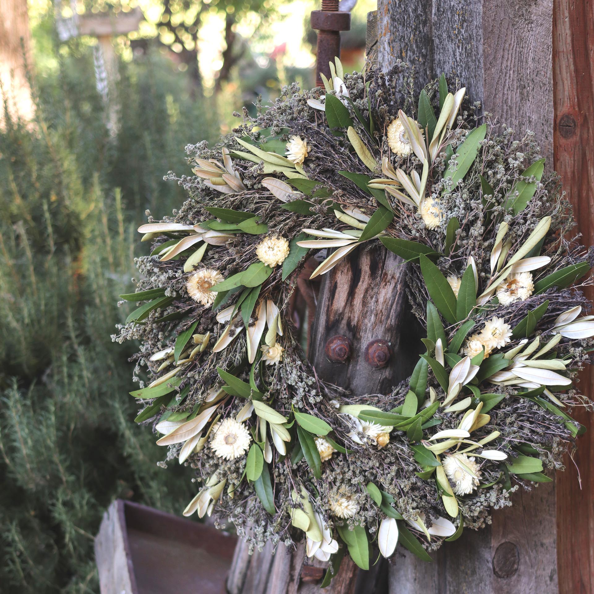 Our floral herb wreath is packed with dried strawflowers, savory, marjoram, integrafolia and fresh bay. The combination of creamy whites and greens on this wreath provide a soothing feel to remember a special person.