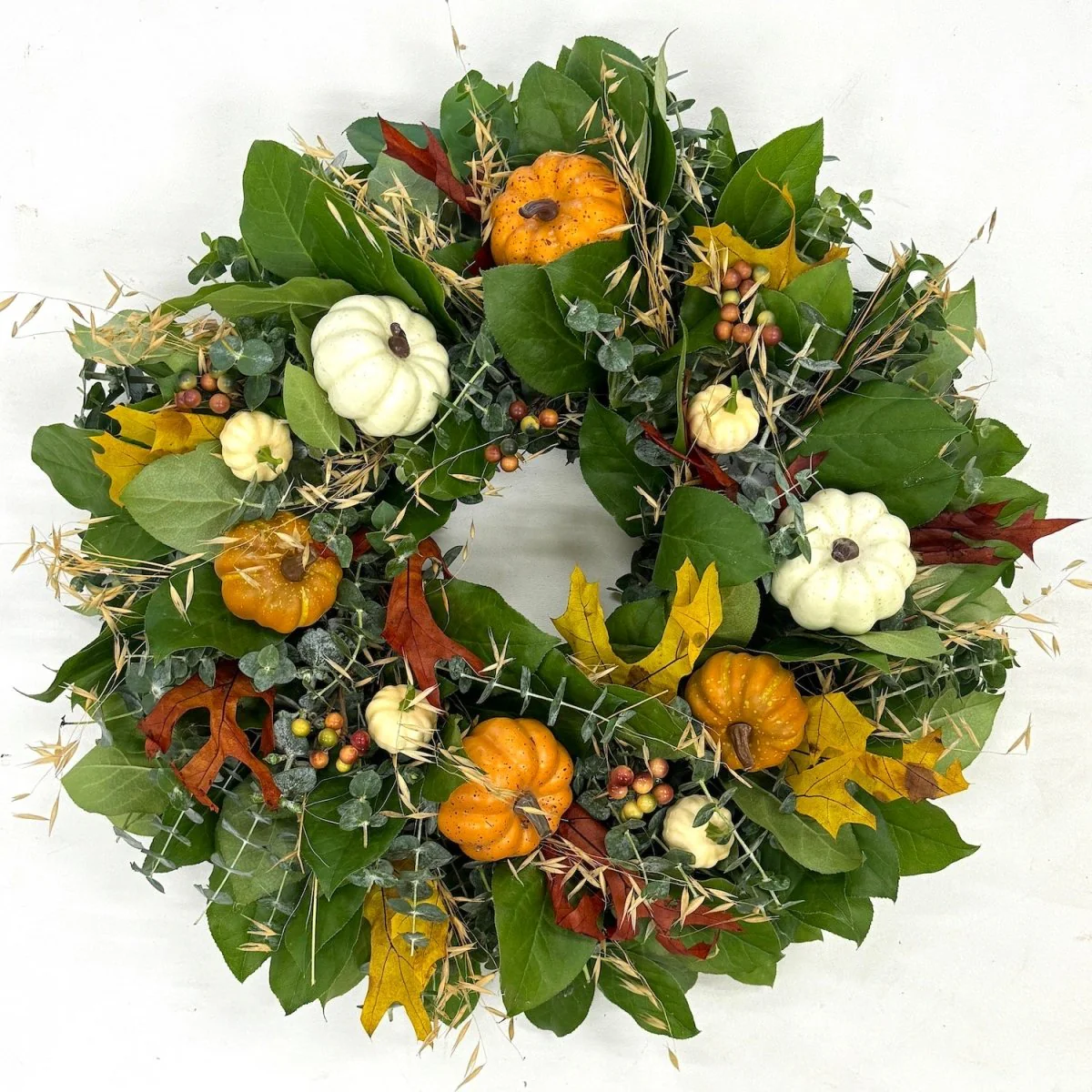 This Pumpkins Galore fragrant wreath is made with fresh eucalyptus and salal and an abundance of different sizes and colors of faux pumpkins, fall leaves, and lacy wheat. The rich colors and textures make it a striking wreath! It is a perfect fall or Halloween wreath for your protected front door, entry, or any wall space.