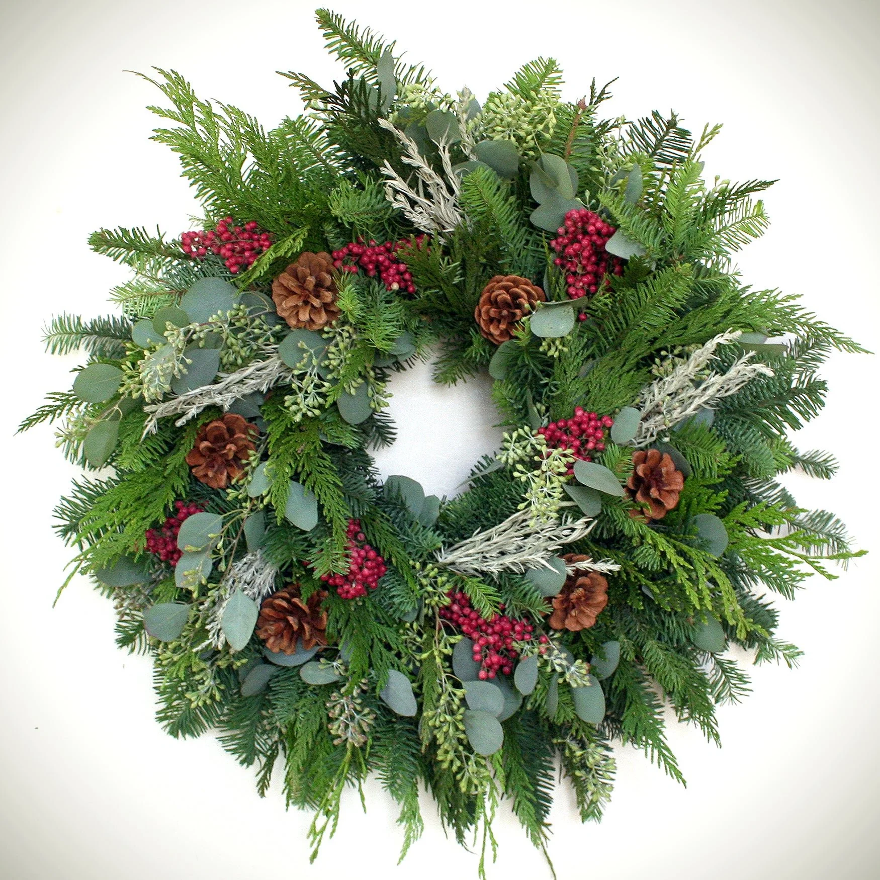 Our Holiday Berries Wreath 20″ is made with a blend of fresh fir and seeded eucalyptus. Pine cones, artemisia, and pepperberries artfully adorn this festive fragrant wreath.
